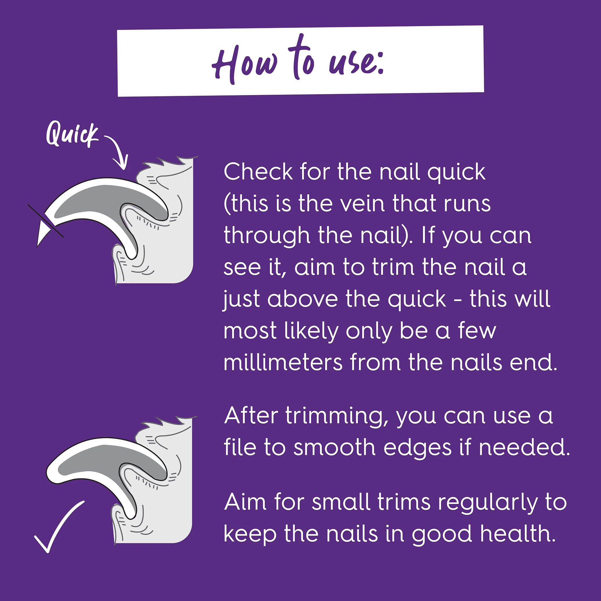 Hold on to paw and position clippers a few millimeters from the nail end. Check to see where the quick (read more on the quick below) finished. Avoiding the quick, push down on the clippers until the nail is cut. Continue on other nails, one at a time. You can use a file to smooth edges if needed.